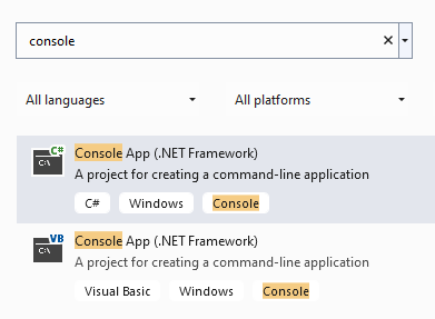 Look for the “Console Application” option, and check that the associated language is C# (cf. below).