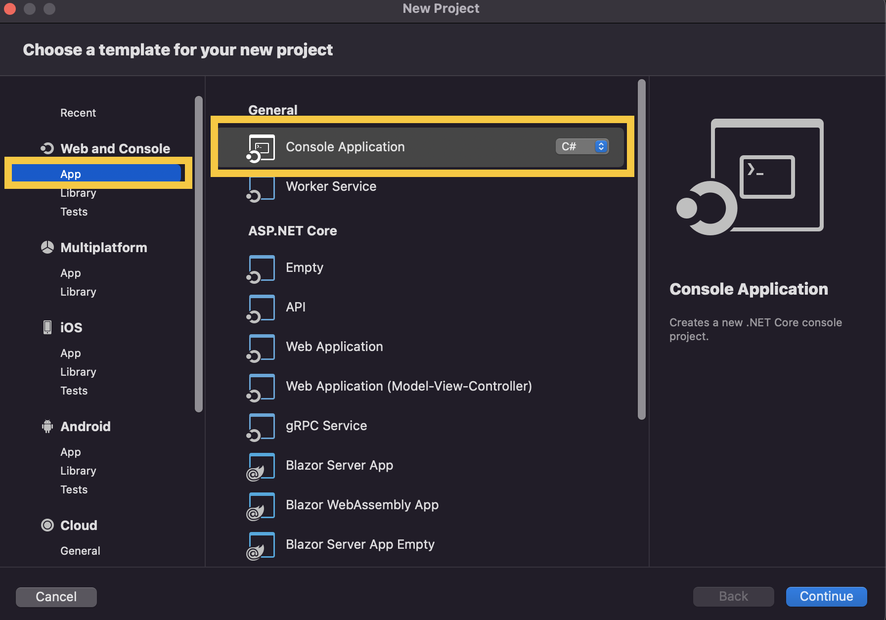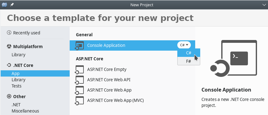 Under “.NET Core”, pick the “App” category, and then click on “Console Application” under “General”. Make sure you pick the C# programming language.