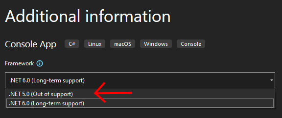 You may see multiple options for a framework (.Net Framework or .NET Core), and you can choose either as it does not make a difference for this class. However, you should make sure that you pick a .NET version strictly less than 6 (ex. NET 5.0) if possible.